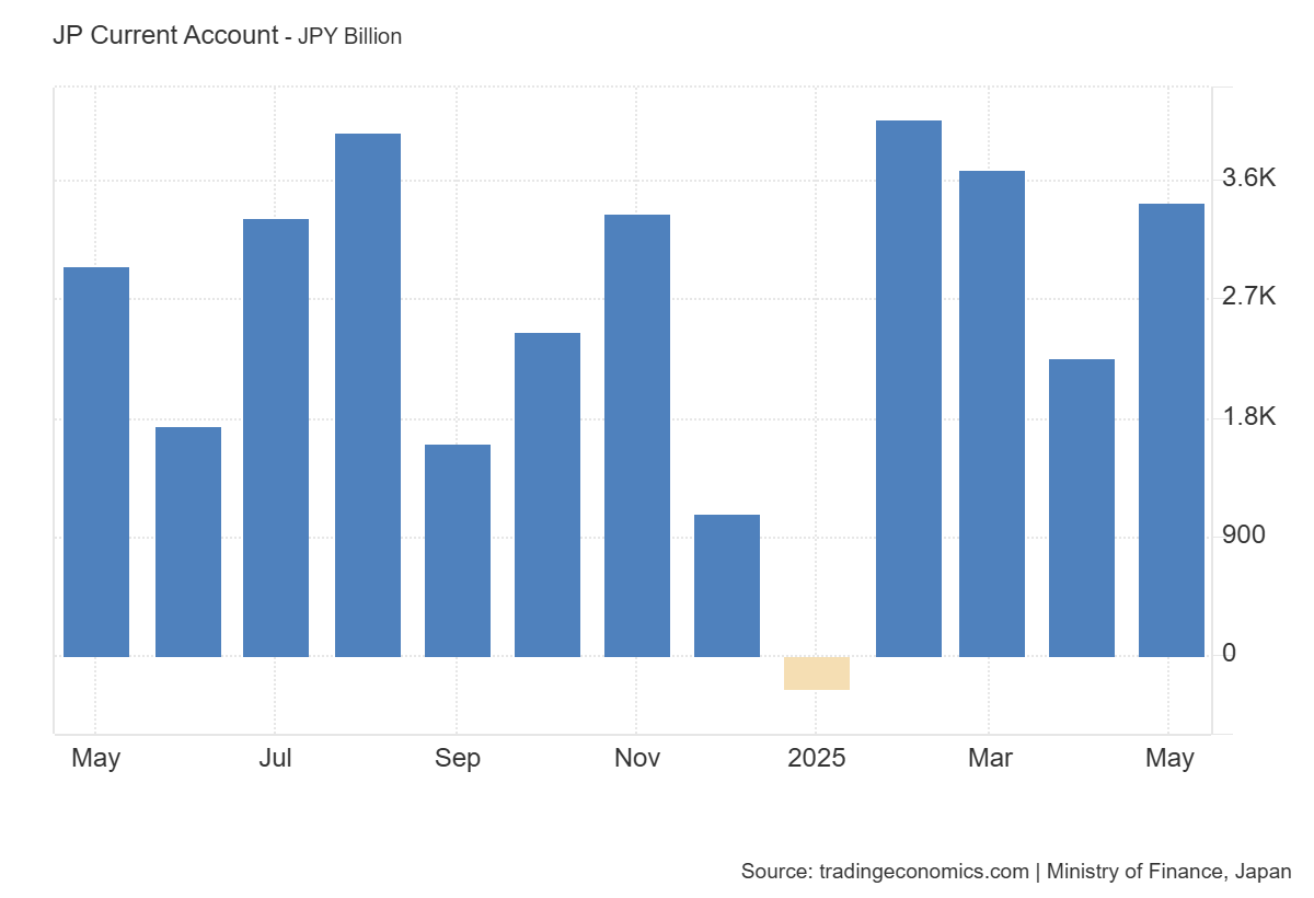 The Current Account reflects the balance of trade in goods and services, as well as net income from overseas investments. A surplus of 3.436 trillion JPY (forecast 2.940 trillion, previous 2.258 trillion) indicates a significant inflow of foreign currency and strengthens Japan’s position as a net creditor.