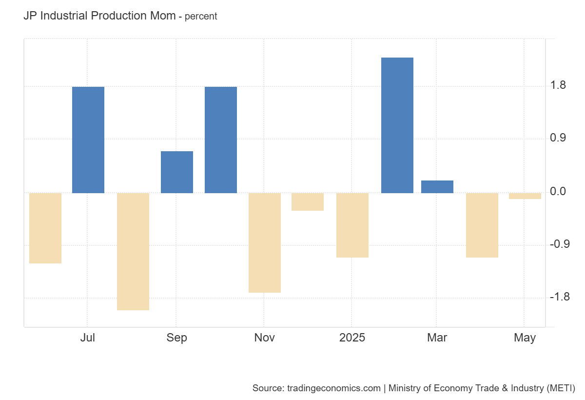 Japan’s industrial production declined by 0.1% in June, falling short of the expected 0.5% growth. The previous reading stood at -1.1%, so the smaller decline suggests a deceleration in the recovery pace of the industrial sector. These weak figures could exert short-term pressure on stocks from machinery, automotive, electronics, and equipment industries.