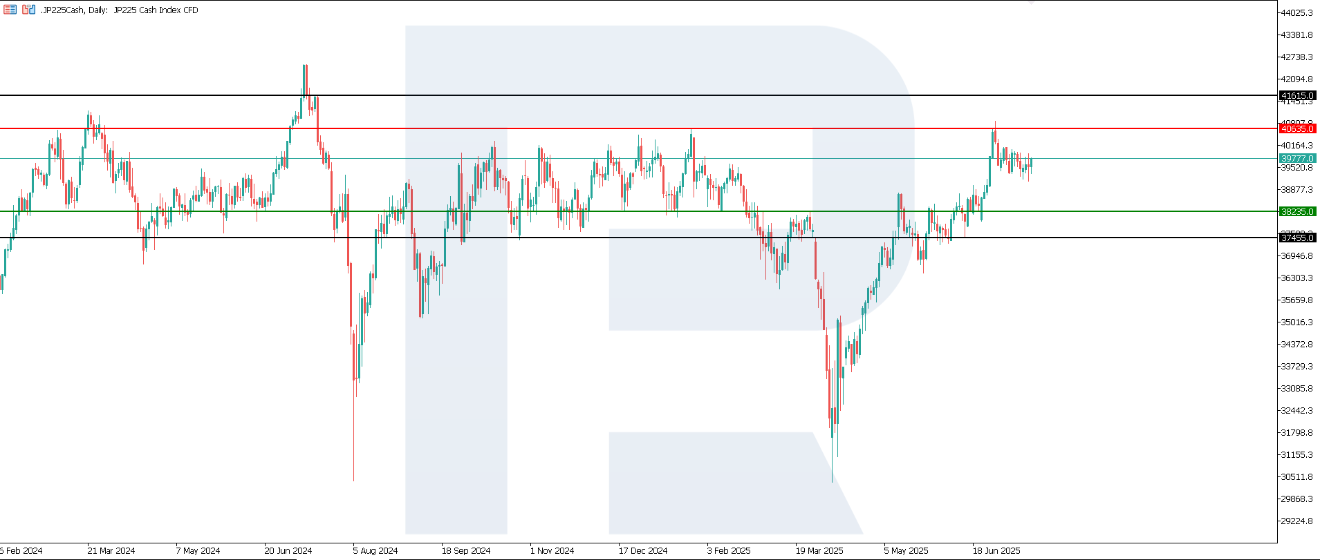 Japan’s industrial production fell by 0.1% in June, falling short of the expected 0.5% increase. This could prompt investor caution in sectors like machinery, automotive, electronics, and equipment. However, the JP 225 continues to trade within a channel aligned with an uptrend. The next upside target lies at 41,615.0, and there are currently no signs of a possible trend reversal.