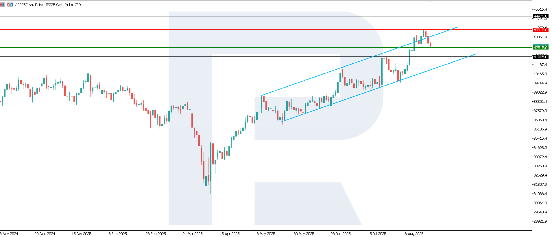 Data shown on the chart indicates that Japan’s quarterly GDP growth was 0.3%, above the forecast of 0.1% and the previous figure of 0.1%. Stronger-than-expected GDP growth signals more resilient economic activity in the country. This suggests increased domestic demand, exports, or investments, which creates a positive backdrop for corporate profits and, consequently, the stock market. Stronger macroeconomic data may also reduce recession concerns, reinforcing investor confidence.