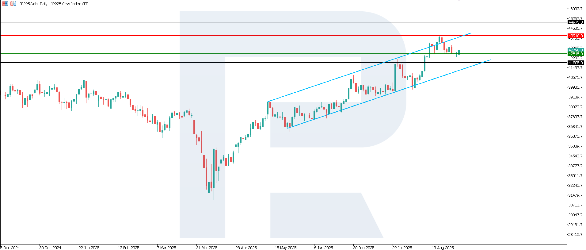 Inflation in Japan remains above target but continues to show signs of slowing. For the JP 225, this creates a balance between support from steady economic activity and the risk of gradual policy tightening. Financial companies look the most resilient, while REITs, utilities, and major exporters remain the most sensitive to interest rates and currency shifts. The next upside target for the JP 225 is 44,215.0.