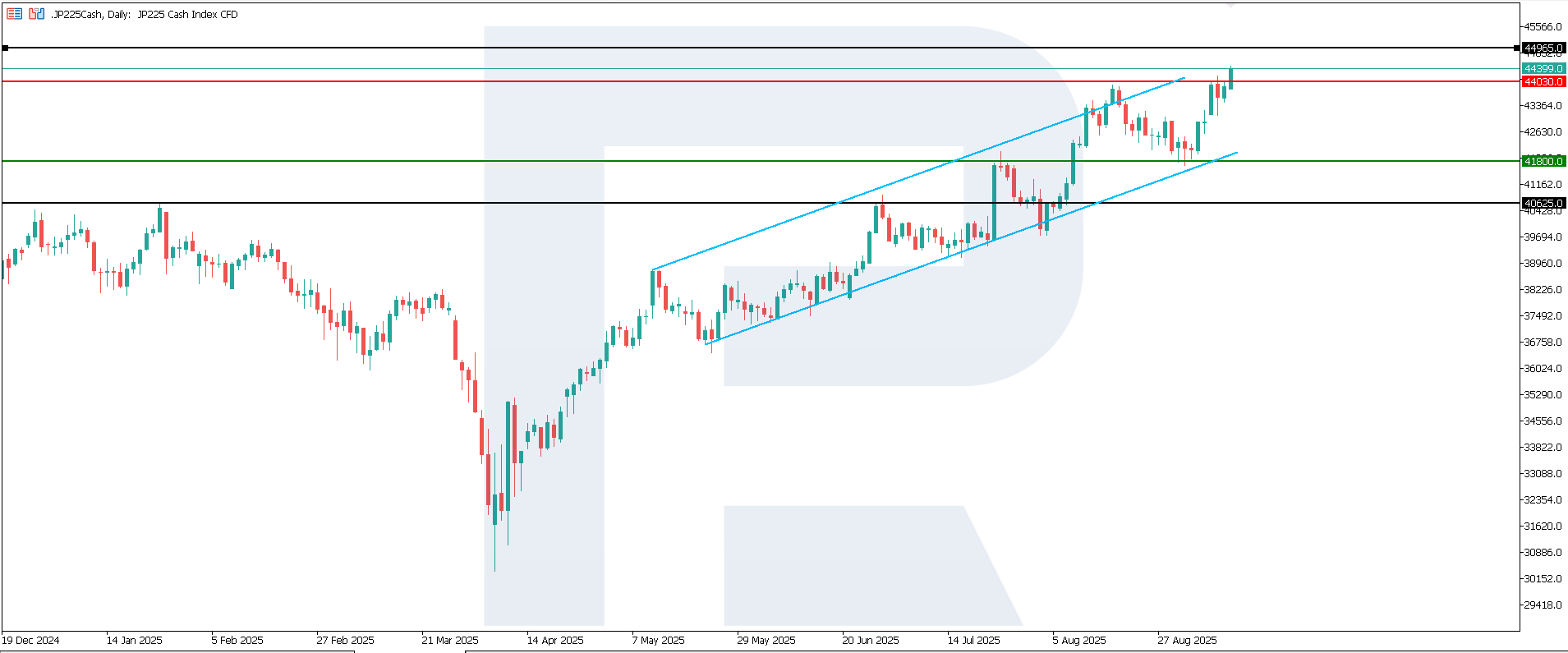 Japan GDP Growth Rate: https://tradingeconomics.com/japan/gdp-growthThe JP 225 index resumed growth and hit a new all-time high. The support level is located at 41,800.0, with resistance at 44,030.0. Currently, there is a high likelihood of further upward movement.