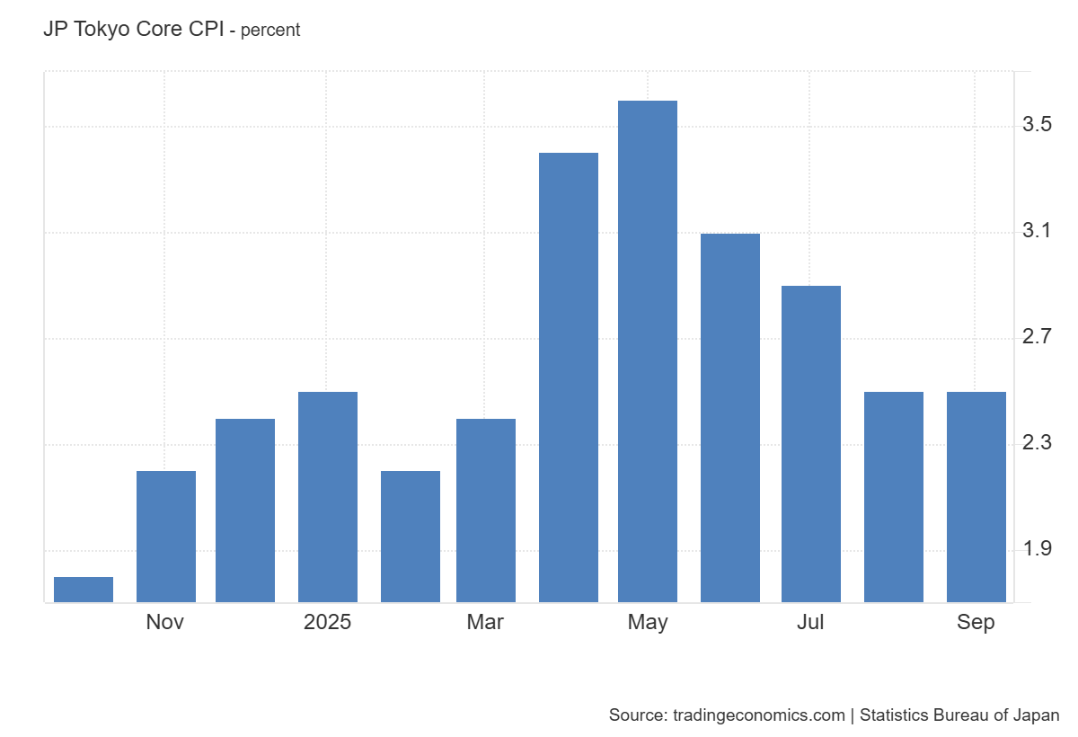 Tokyo’s core Consumer Price Index stood at 2.5% year-on-year, below the consensus forecast of 2.8% and unchanged from the prior month. This shows that inflationary pressure in Japan’s largest metropolitan area remains stable and softer than expected. For equity markets, this reduces the likelihood of accelerated monetary policy normalisation by the Bank of Japan. The case for aggressive tightening has weakened, which supports valuations for assets sensitive to discount rates.