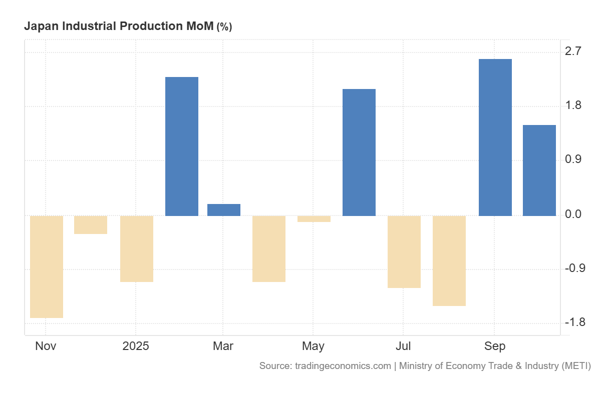 Japan Industrial Production MoM printed at +1.5% for the month, compared with a forecast of +1.4%, following +2.6% in the previous month. This means industrial output grew slightly faster than expected, although the pace of growth slowed compared with the prior period. Rising production usually signals stronger order inflows, higher capacity utilisation, and an improved chance for companies to deliver solid revenue and profit growth in the coming quarters.