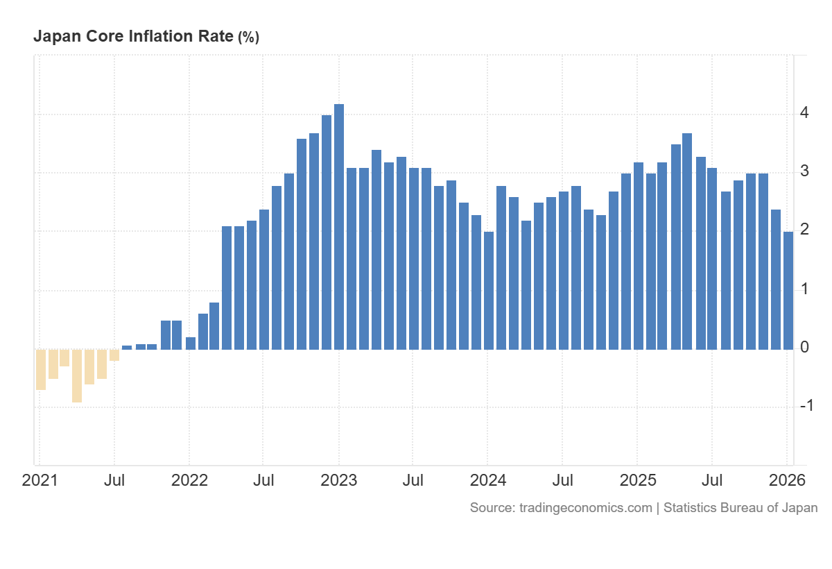 The release of Japan’s core inflation at 2.0% year-on-year, in line with the 2.0% forecast and down from the previous 2.4%, primarily signals a continued slowdown in price pressure and a move closer to the target level. Since the figure matched expectations, there was no surprise factor, and the immediate market reaction is typically limited. However, the decline compared to the previous period shifts medium-term investor expectations regarding monetary policy and bond yield dynamics, which already affects the valuation of Japanese equities.