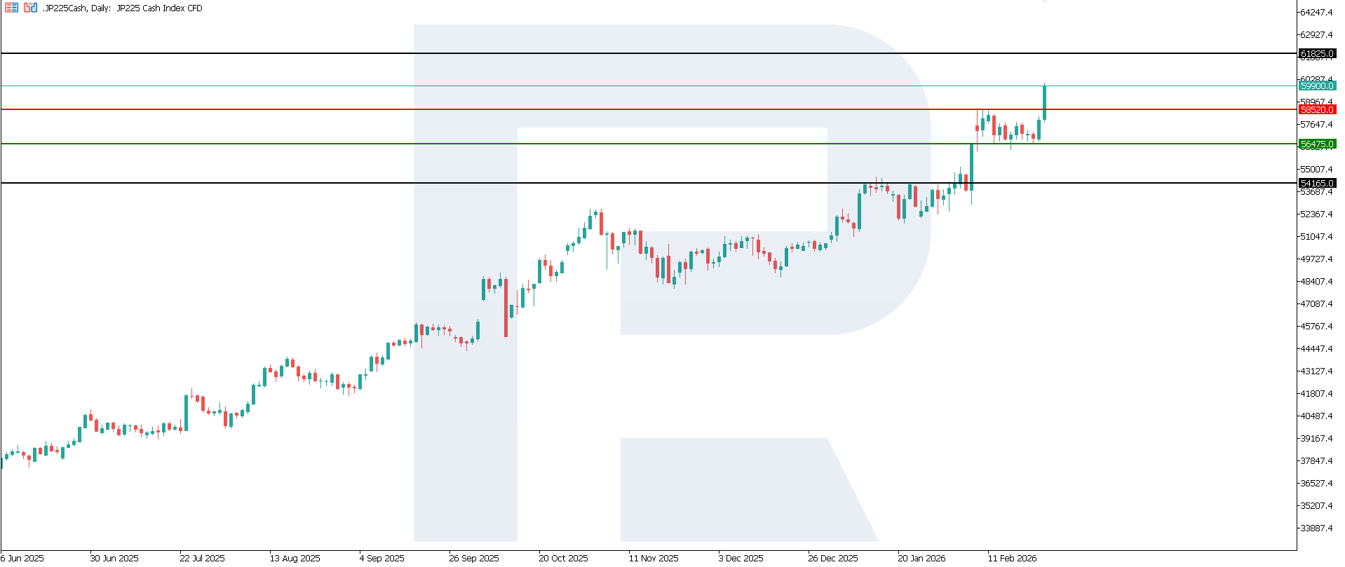 Japan’s core inflation rate: https://tradingeconomics.com/japan/core-inflation-rateThe JP 225 index maintains its upward momentum. The key support level is located at 56,475.0, while the nearest resistance level at 58,520.0 has been broken. The current rise is medium-term, with no signs of a reversal so far. The next target could be 61,825.0.