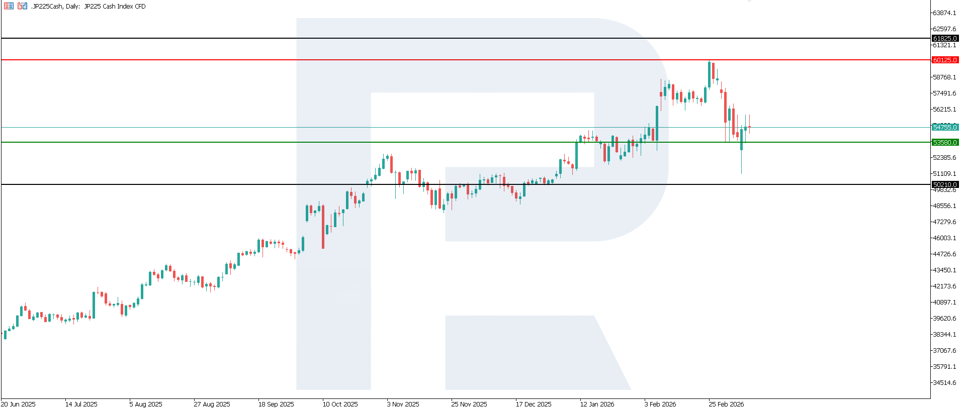 Japan’s GDP growth rate: https://tradingeconomics.com/japan/gdp-growthThe JP 225 index has completed its correction and moved into a sideways range. The key support zone is at 53,580.0, while the nearest resistance level has formed around 60,125.00. At this stage, it is difficult to estimate how long the current sideways trend will last. The next downside target could be 52,630.0.