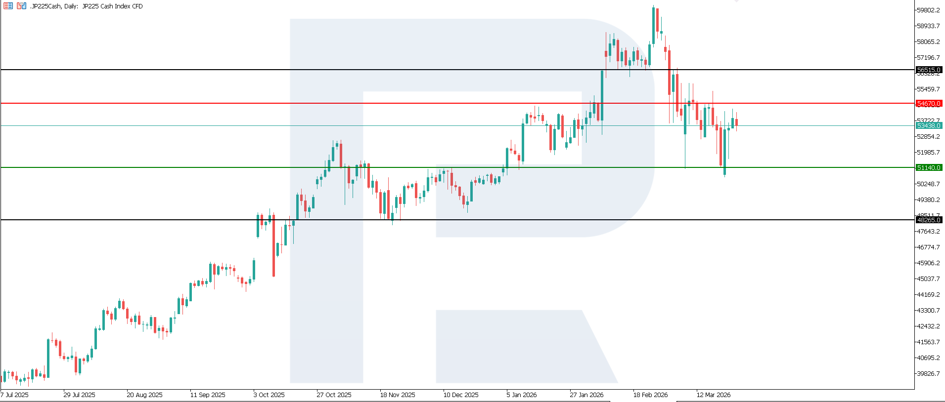Japan’s interest rate: https://tradingeconomics.com/japan/interest-rateThe JP 225 index maintains its downward momentum, indicating the formation of a persistent bearish trend. The nearest support level is located at 51,140.0, while the nearest resistance is around 54,670.0. At this stage, it is difficult to estimate how long this decline may last. The next potential downside target is seen at 48,265.0.