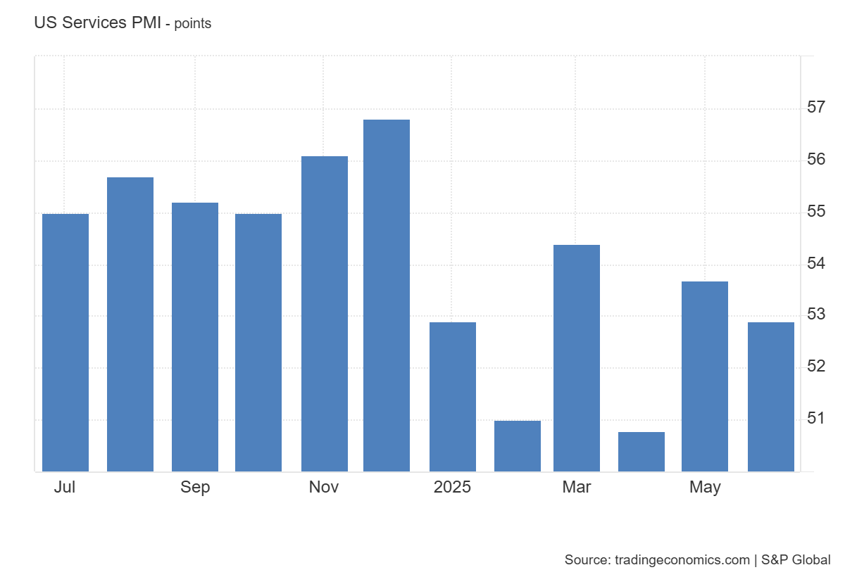 The US services PMI of 52.9 slightly missed expectations of 53.1 and the previous result of 53.1, signalling a mild slowdown in service sector activity. Industries such as consumer services, financials, healthcare, and real estate – all closely tied to the services economy – may face pressure or slower profit growth. Meanwhile, industrial and tech companies could maintain steadier performance if their outlook is less dependent on services.
