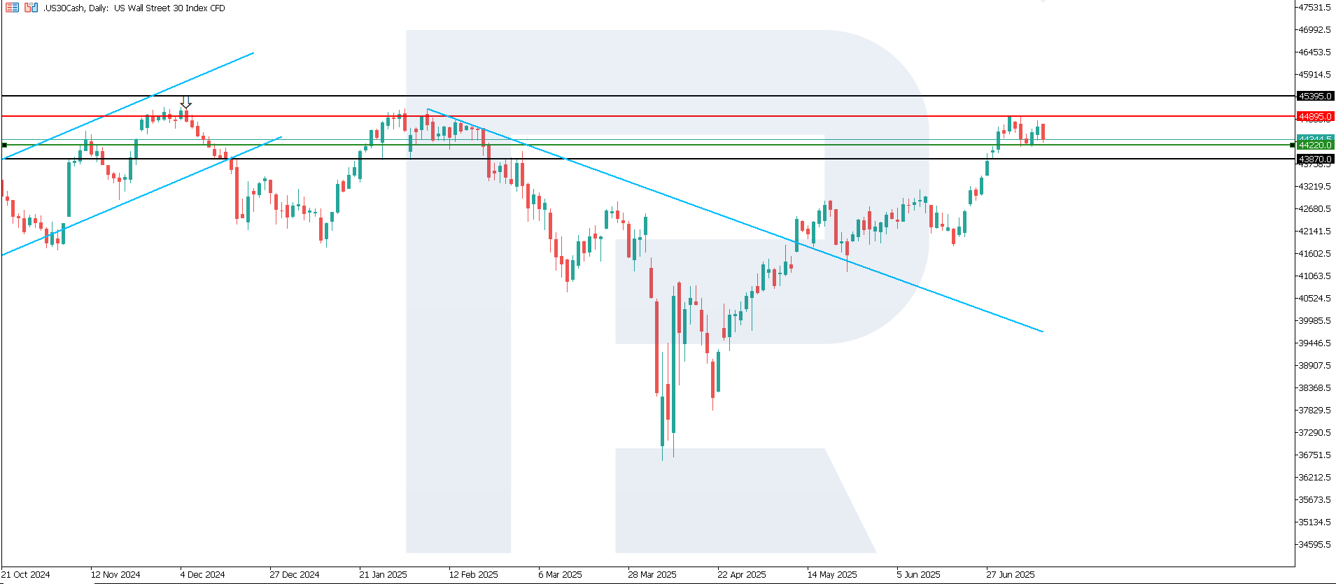 The US 30 index shows elevated volatility, with the trend shifting once again – this time to a downtrend. However, the recent breakout below the 44,350.0 support level might prove to be a false signal. The US services PMI is a key gauge of activity in the services sector, which makes up around 70% of US GDP. The latest reading came in at 52.9, below the forecast of 53.1 and the previous result of 53.1, indicating a moderate slowdown, while the sector remains in expansion.