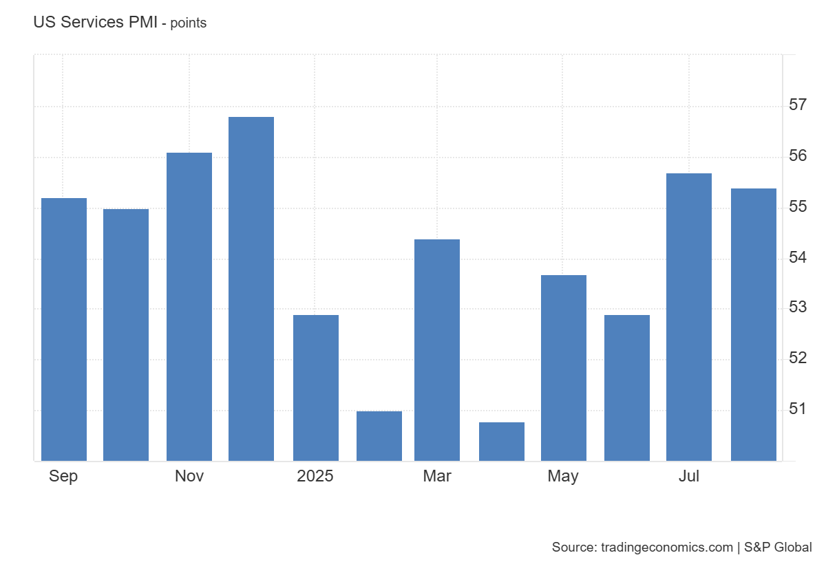 The published services PMI for July 2025 came in at 55.4 points, above the forecast of 54.2 but slightly lower than the previous reading of 55.7. This figure shows that the services sector continues to demonstrate solid growth, remaining well above the key 50-point threshold that separates expansion from contraction. As the services sector accounts for more than two-thirds of US GDP, its steady performance indicates the economy’s overall positive momentum.