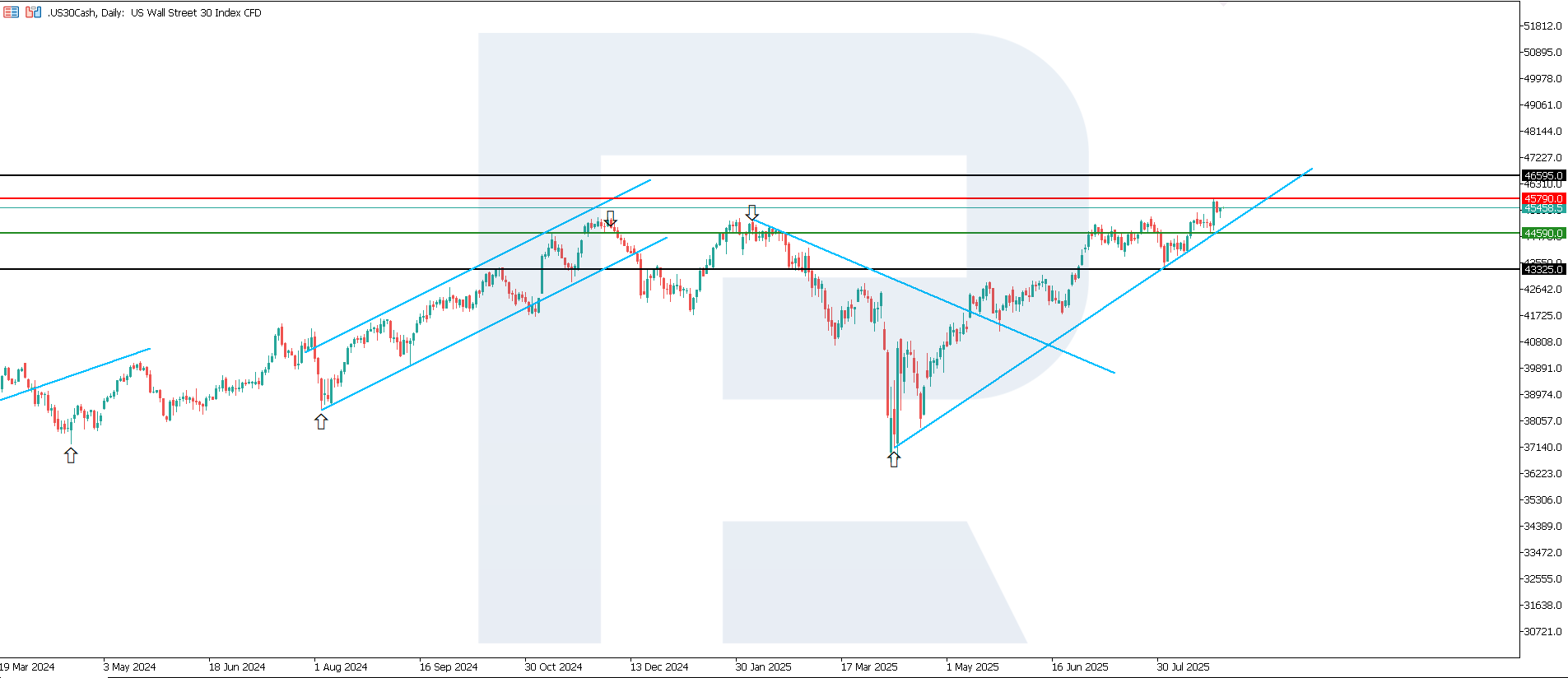 PMI data is perceived by the market as generally positive for equities and the US 30 in the short term, but investors remain attentive to the Fed’s policy stance and its response to inflation dynamics. The financial sector benefits from stable economic activity that supports lending and investment processes. Tech and communications firms also gain indirectly, as services growth increases demand for digital solutions and online platforms. The next upside target for the index could be 46,595.0.