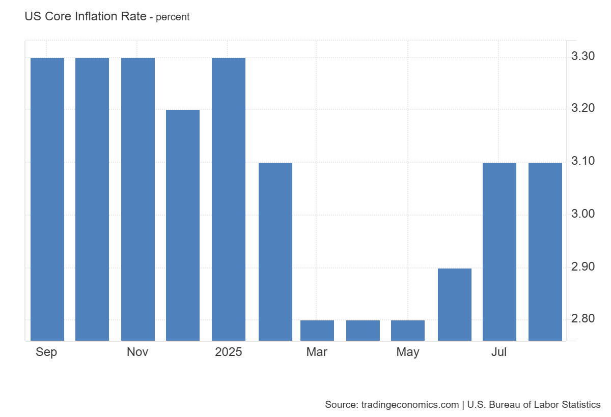The US core CPI for August 2025 showed growth of 3.1% year-on-year, matching analysts’ forecasts and remaining unchanged from the previous month. This reflects persistent inflationary pressure in the economy, excluding volatile food and energy categories.