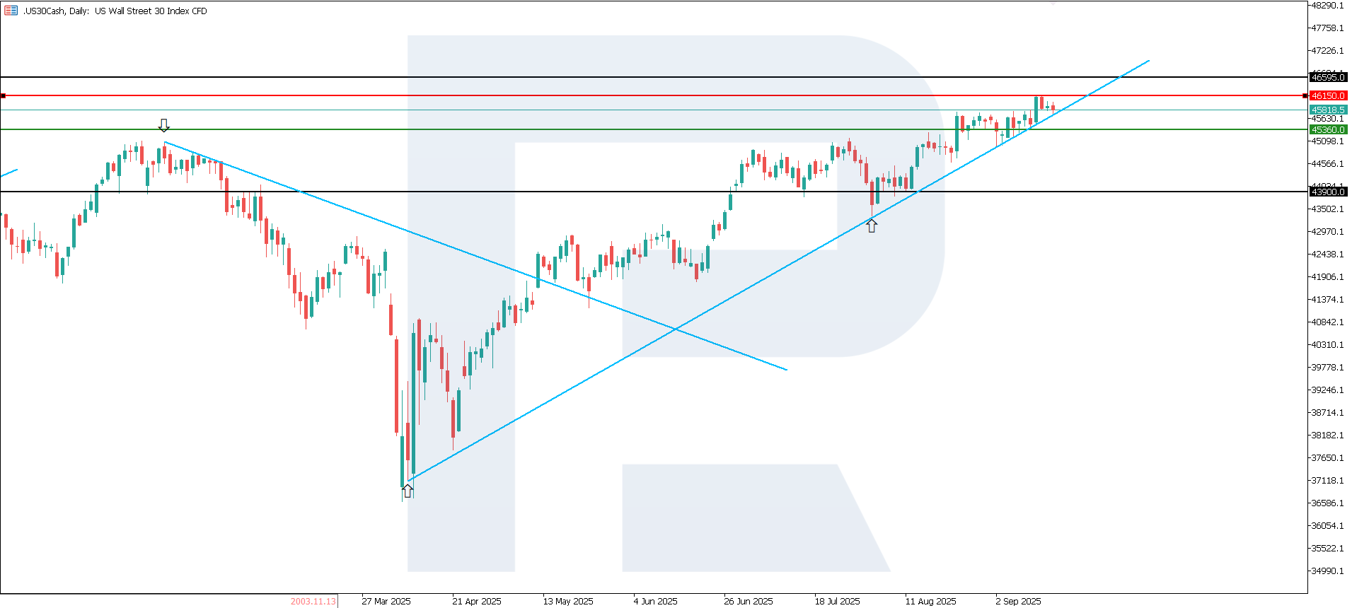 The release of core CPI data at 3.1% reinforces expectations of a slower pace of Fed rate cuts. For the US 30 index, this signals limited upside potential in the short term: the positive factor of data stability is balanced by risks tied to high capital costs and pressure on corporate margins. The next target for growth could be 46,595.0.