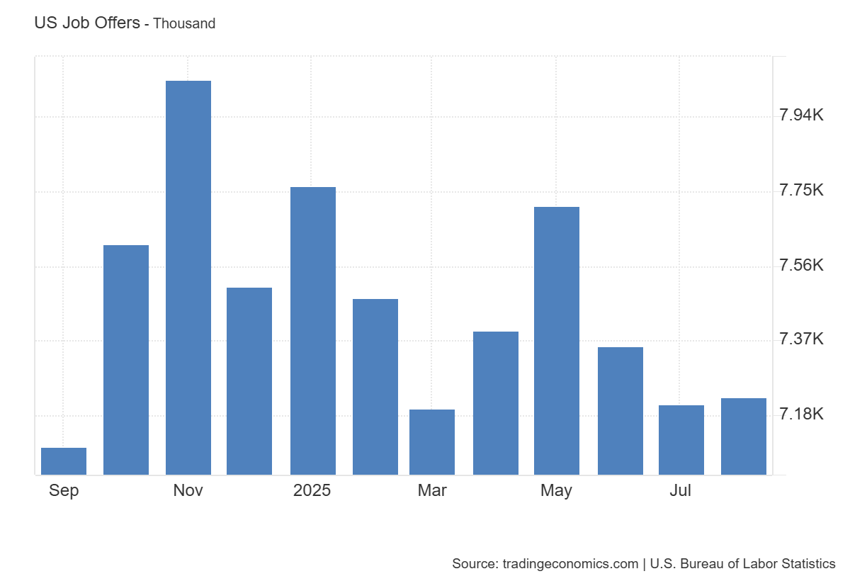 The JOLTS report showed 7.23M job openings versus a forecast of 7.19M and 7.21M in the previous month. This points to sustained labour demand and underlines the resilience of the job market. Although the increase was modest, it reduces the likelihood of a swift easing of labour market tightness and could maintain upward pressure on wages and core services inflation.