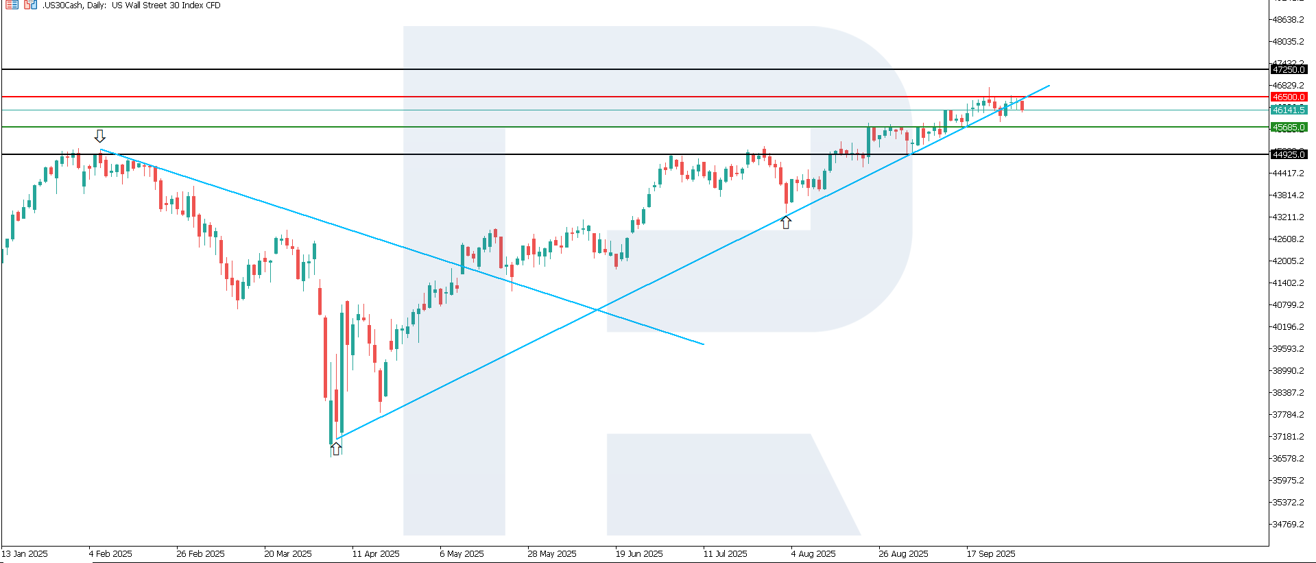 US manufacturing PMI: https://tradingeconomics.com/united-states/manufacturing-pmiThe US 30 index continues to trade in an uptrend, marking fresh record highs. Resistance is set at 46,500.0, while support lies at 45,685.0. Elevated volatility highlights the fragility of the current trend, and near-term upside potential remains capped.