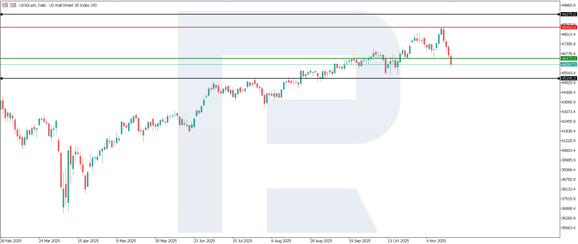 US initial jobless claims: https://tradingeconomics.com/united-states/jobless-claimsThe US 30 index entered a downtrend after breaking below the 46,475.0 support level. A new resistance level formed at 48,460.0. Volatility remains elevated, so the trend may change in the short term. The nearest downside target lies at 45,195.0.