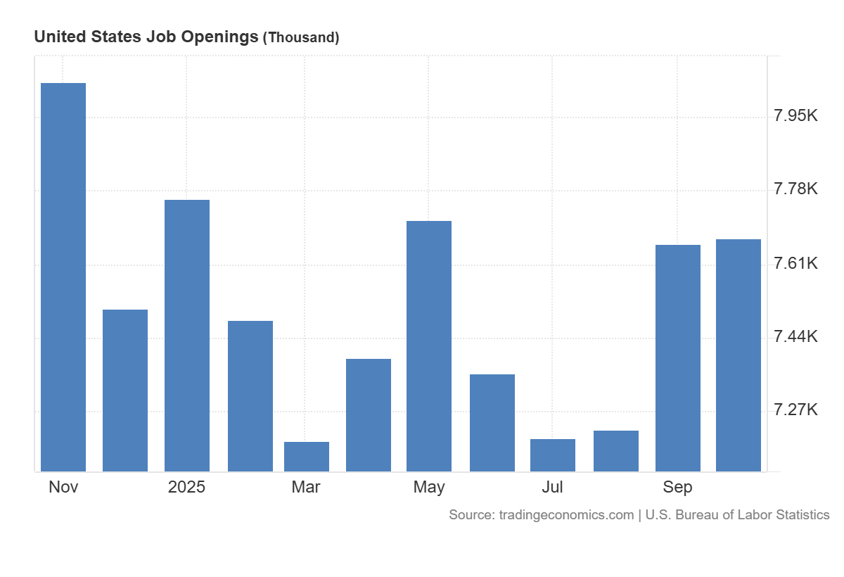 The latest JOLTS job openings report showed 7.670 million, slightly above the previous reading of 7.658 million. Although the increase is modest, it confirms that the labour market remains resilient and demand for workers is still high. For financial markets, this is a sign that the economy continues to show strength. However, such data also reduces the likelihood that the Federal Reserve will begin to cut rates aggressively. A strong labour market can maintain inflationary pressure, which means the Fed will likely keep a cautious approach.