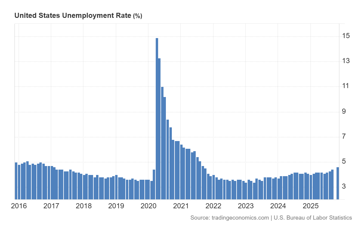 November U.S. labour market data turned out to be mixed. On the one hand, the economy created around 64K new jobs, which exceeded expectations, indicating that companies are still hiring overall. On the other hand, the unemployment rate rose to 4.6%, above both the previous reading and the forecast. This report paints a picture of an economy that is cooling, but not collapsing. Such a backdrop gives the Federal Reserve room to provide further cautious support to the economy if needed. Markets currently assess the probability of another rate cut at the January 2026 meeting as low (around 24%).