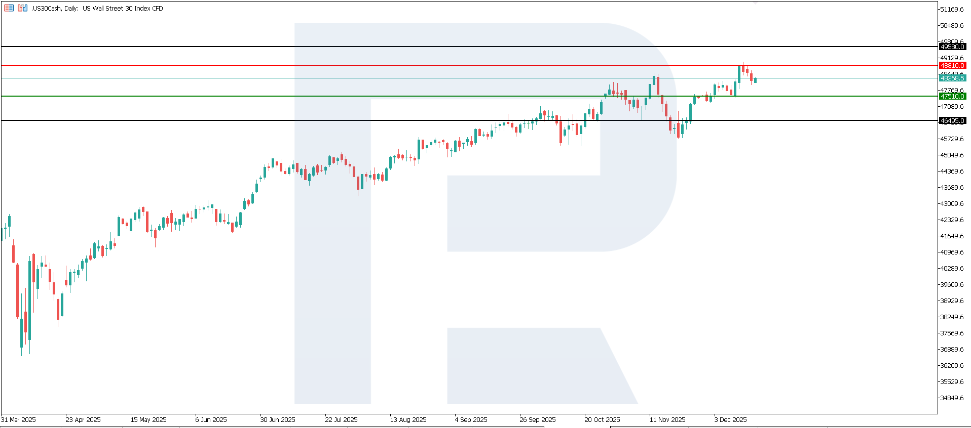 The latest data is contradictory, but the overall trend is clear. On the one hand, November job creation exceeded analysts’ expectations, which can be seen as a positive surprise. On the other hand, the gain of 64K jobs is very modest compared with the 105K job losses recorded in October. The nearest upside target for the index remains 49,580.0.