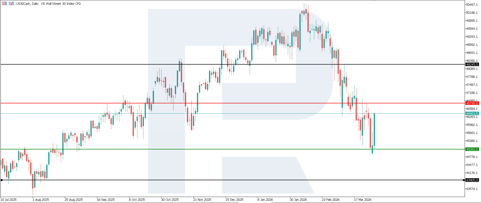 United States Manufacturing PMI: https://tradingeconomics.com/united-states/manufacturing-pmiThe US 30 index has entered a downtrend, with the key support level at 46,430.0. The resistance level formed at 48,250.0. The price is currently undergoing a correction, but a trend reversal is unlikely. The nearest downside target is located around 45,430.0.