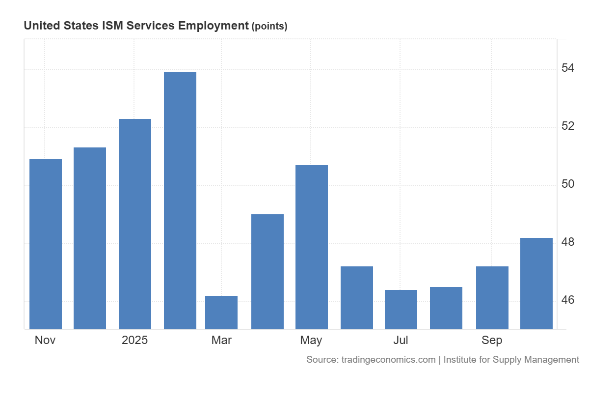 The ISM Non-Manufacturing Employment Index stood at 48.2 points, compared with the forecast of 47.6 and the previous reading of 47.2. Although the indicator remains below the neutral 50.0 mark, formally signalling contraction in the services sector’s employment, its uptrend suggests gradual improvement. For the US stock market, this indicates that the pressure on the labour market from the services sector is easing: the rate of job reduction is slowing, which lowers the likelihood of a sharp macroeconomic downturn or a hard-recession scenario.