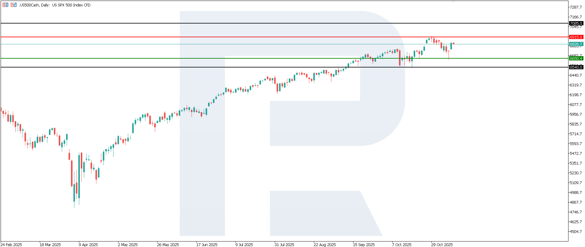 In the short term, the US 500 will likely show lower volatility and maintain an upward or sideways trend. The index’s next direction will depend on confirmation of current signals by upcoming employment and inflation data. From a technical perspective, the US 500 may rise towards 7,085.0.