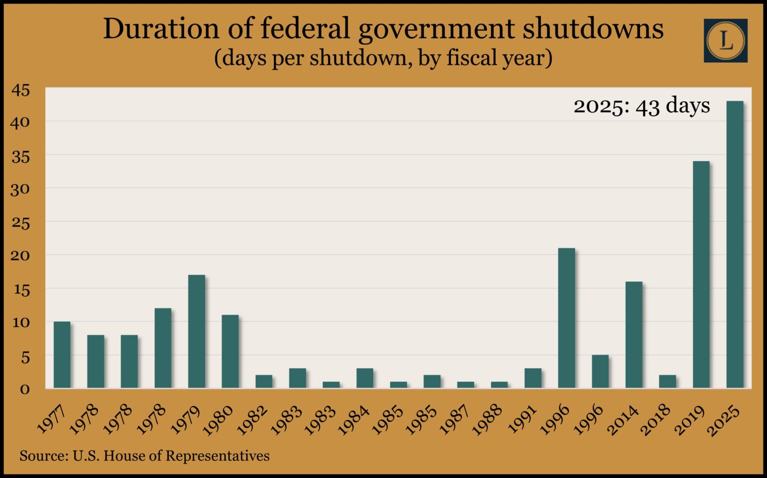 Duration of federal government shutdowns (days per shutdown, by fiscal year): https://www.landaas.com/podcast/money-talk-podcast-friday-nov-14-2025/The US 500 index has approached the 6,655.0 support level, with resistance at 6,915.0. Prices may break below support, causing the trend to reverse downwards. In this case, the downside target could be near 6,540.0.