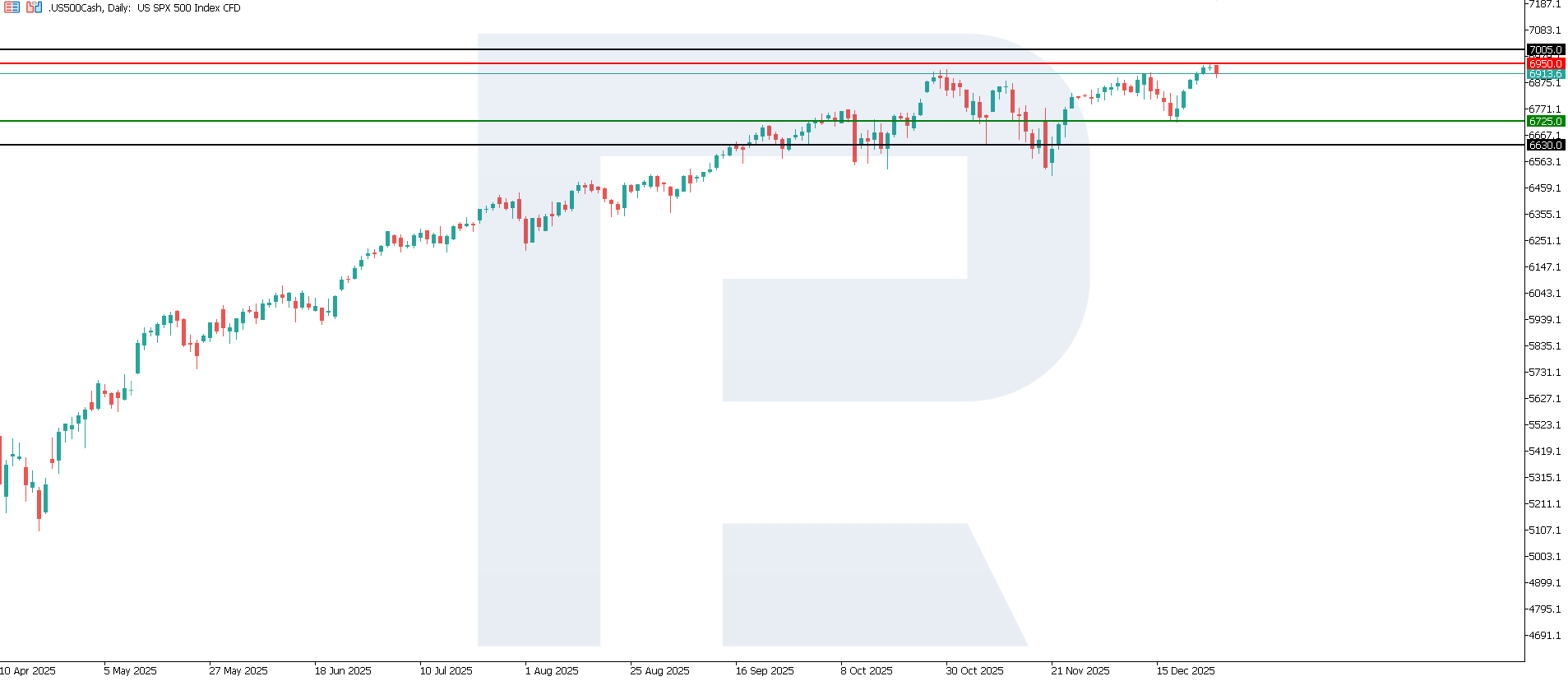 Overall, the latest macroeconomic data create a cautiously neutral backdrop for the US equity market. This suggests the absence of a clear directional impulse: fundamental factors simultaneously support expectations of further monetary easing by the Federal Reserve while restraining optimism regarding corporate performance. As a result, the US 500 is likely to trade with heightened sensitivity to incoming macroeconomic data. From a technical perspective, the index may rise toward 7,005.0.