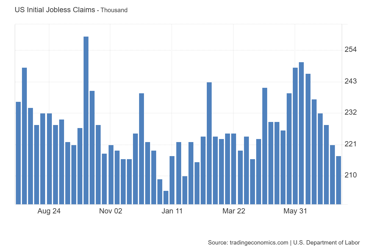 Initial jobless claims came in at 217 thousand, below the forecast of 227 thousand and the previous figure of 221 thousand. This points to a resilient labour market, with job losses remaining low. Fewer claims suggest continued economic stability, supporting consumer spending and lowering the likelihood of an imminent downturn.