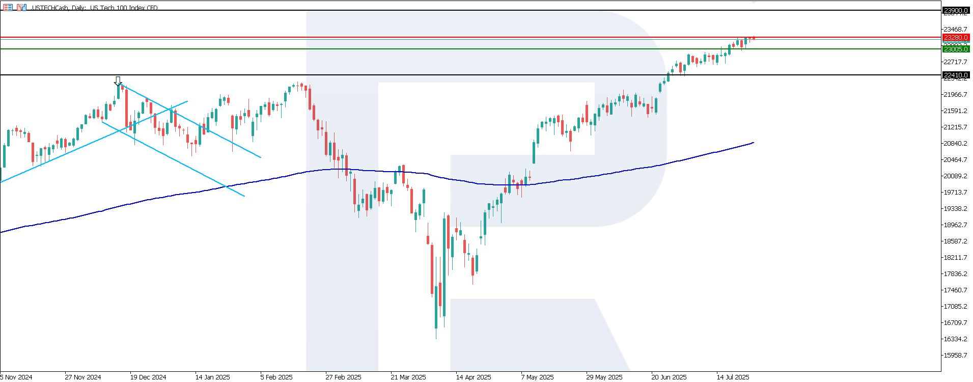 The US Tech index broke above the previous resistance level at 22,900.0, with a new one formed at 23,280.0. The support level has shifted to 23,005.0. The US Tech index reached another all-time high, with the rally likely to continue towards 23,900 before a corrective pullback begins.