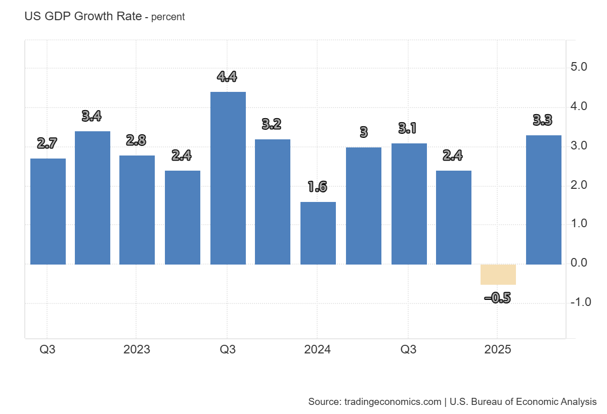 US GDP Growth Rate: https://tradingeconomics.com/united-states/gdp-growthFor US equities, such growth is seen as positive, as it indicates resilient demand, improving corporate earnings, and greater economic stability against external shocks. At the same time, faster economic expansion could raise expectations of tighter Federal Reserve monetary policy, creating potential risks for the revaluation of rates and capital costs.