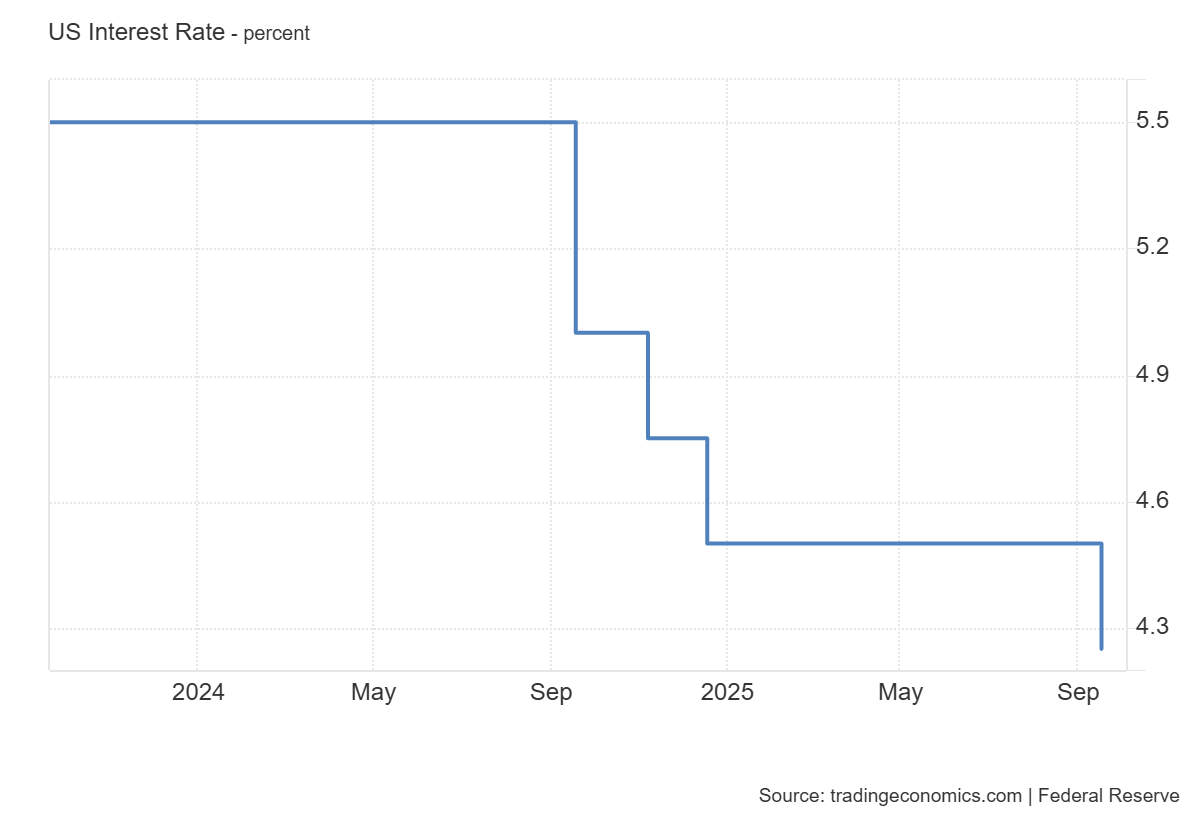 The Federal Reserve’s decision to lower the key rate from 4.50% to 4.25%, in line with market expectations, sends a significant signal to US financial markets. The rate cut reflects the Fed’s intention to support economic activity amid slowing GDP growth and labour market weakness. Lower rates reduce borrowing costs for corporations and households, potentially stimulating investment and consumption. However, Jerome Powell’s accompanying comments pointed to persistent inflation risks, partly driven by tariff policy, which tempers excessive investor optimism.