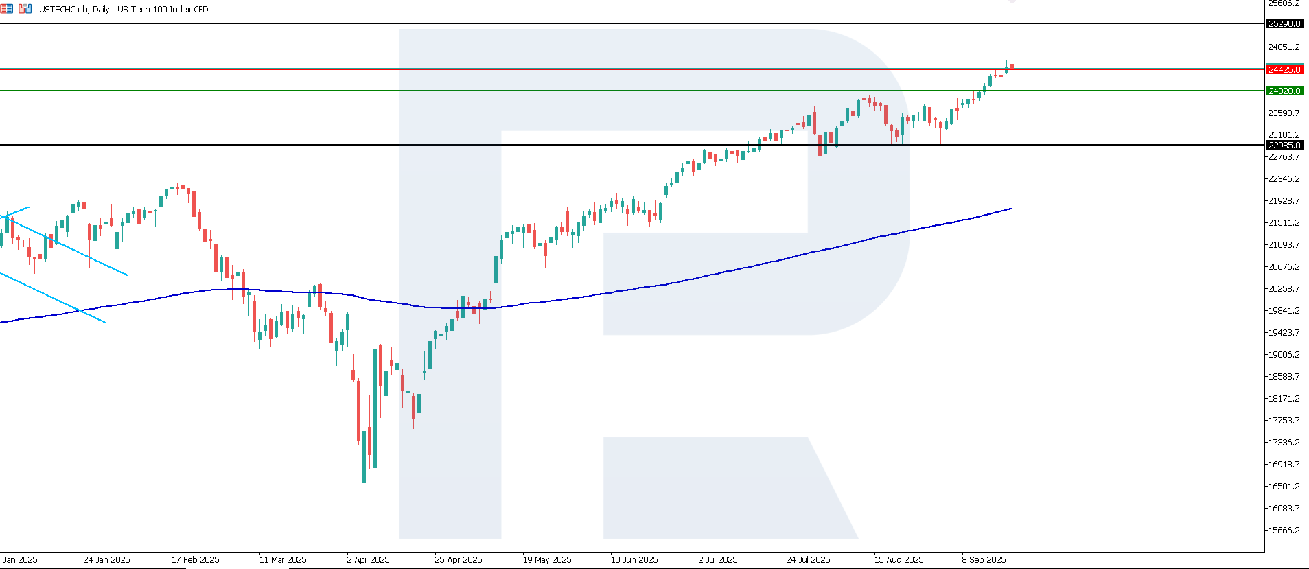 US Tech technical analysis for 19 September 2025The US Tech index broke above the previous resistance level at 24,425.0, with a new support line formed at 24,020.0. A new resistance level is yet to form. The uptrend will likely be medium-term, with the nearest upside target at 25,290.0.