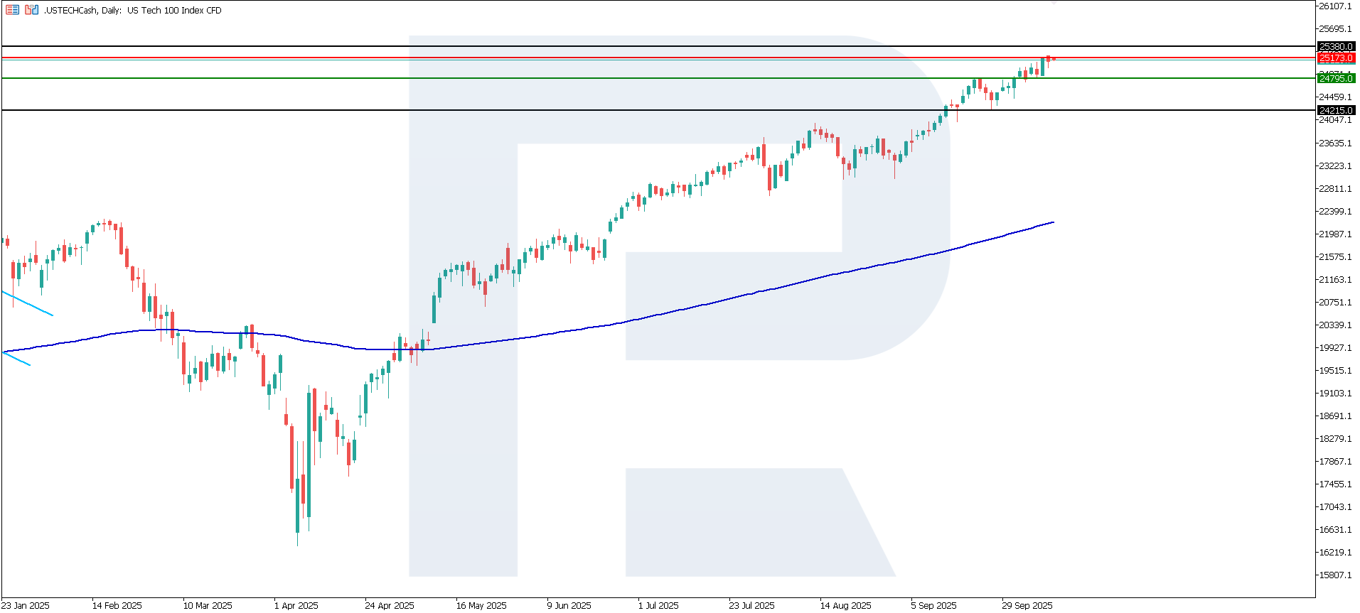 US Tech technical analysis for 10 October 2025The US Tech index has hit a new all-time high, forming a resistance level at 25,173.0 and a new support area at 24,795.0. The uptrend will likely be medium-term, with the nearest upside target at 25,380.0.