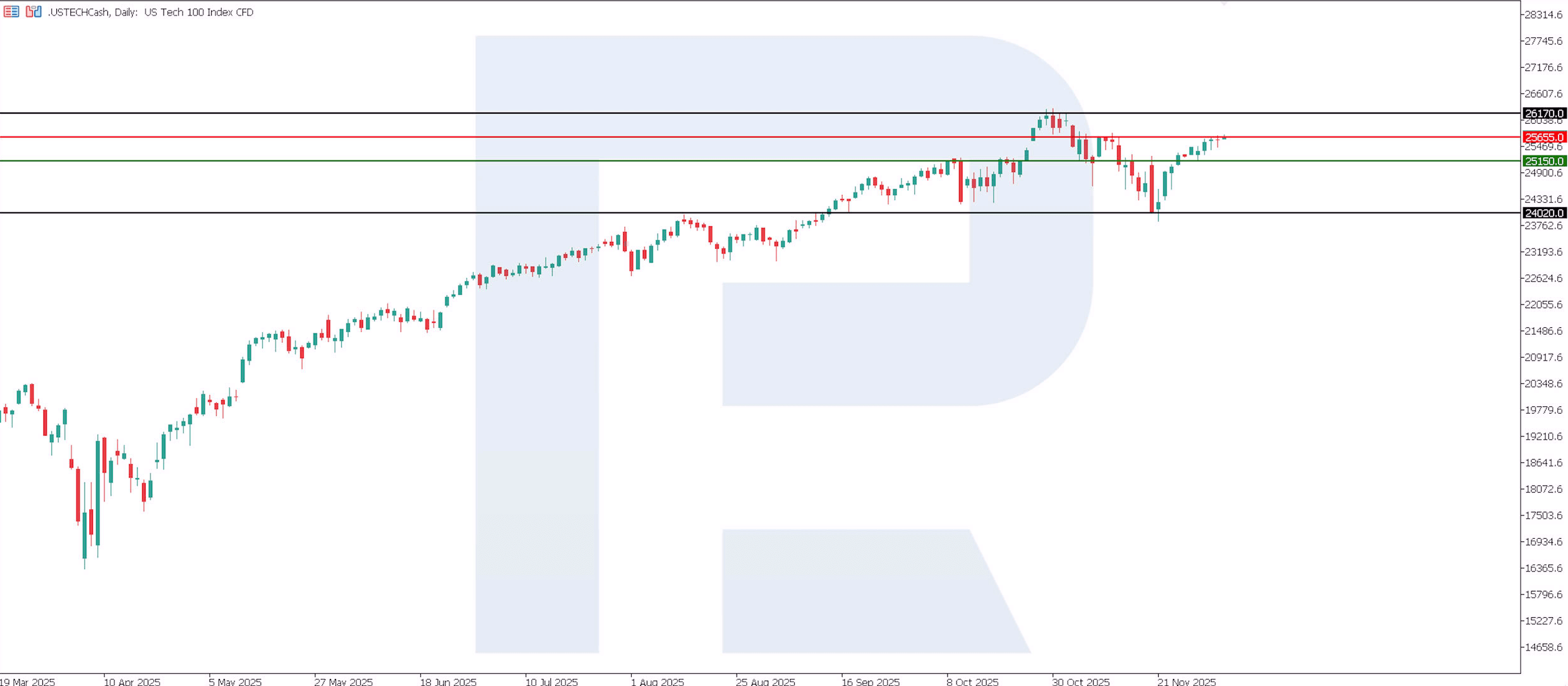 The latest ADP report creates a backdrop of heightened volatility for the US stock market and the US Tech index. For the broader market, it signals rising macroeconomic risks while simultaneously strengthening expectations of Fed easing. For the technology sector, the near-term outlook may favour growth thanks to falling bond yields and increased capital inflows into growth stocks. However, the durability of this effect will depend on whether the labour market weakness proves temporary or becomes a persistent trend. The next upside target could be the 26,170.0 level.