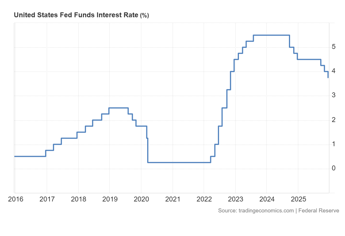 The Federal Reserve’s decision to reduce the key interest rate to 3.75% (from 4.00%), fully in line with market expectations, creates a broadly supportive backdrop for US financial markets. Lower interest rates reduce the cost of borrowing across the economy, making credit cheaper for both companies and consumers. This supports economic activity and improves financial conditions for businesses. For equity markets, such decisions usually act as a positive catalyst. Lower rates increase the relative attractiveness of equities compared with bonds, as bond yields decline.