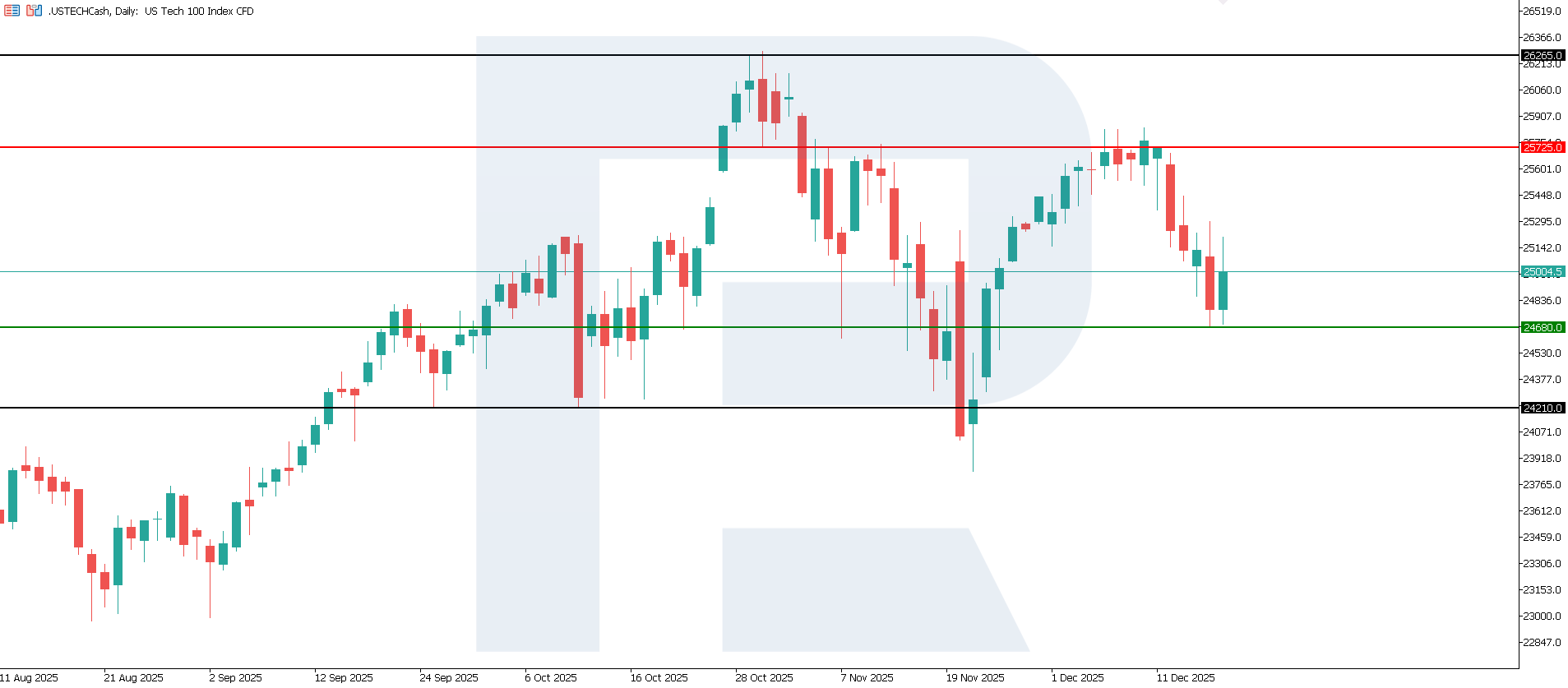 US Tech technical analysis for 19 December 2025The US Tech index has entered a downward trend. The nearest resistance formed at 25,725.0, while the support level shifted to 24,680.0. The downside target may lie near 24,210.0.