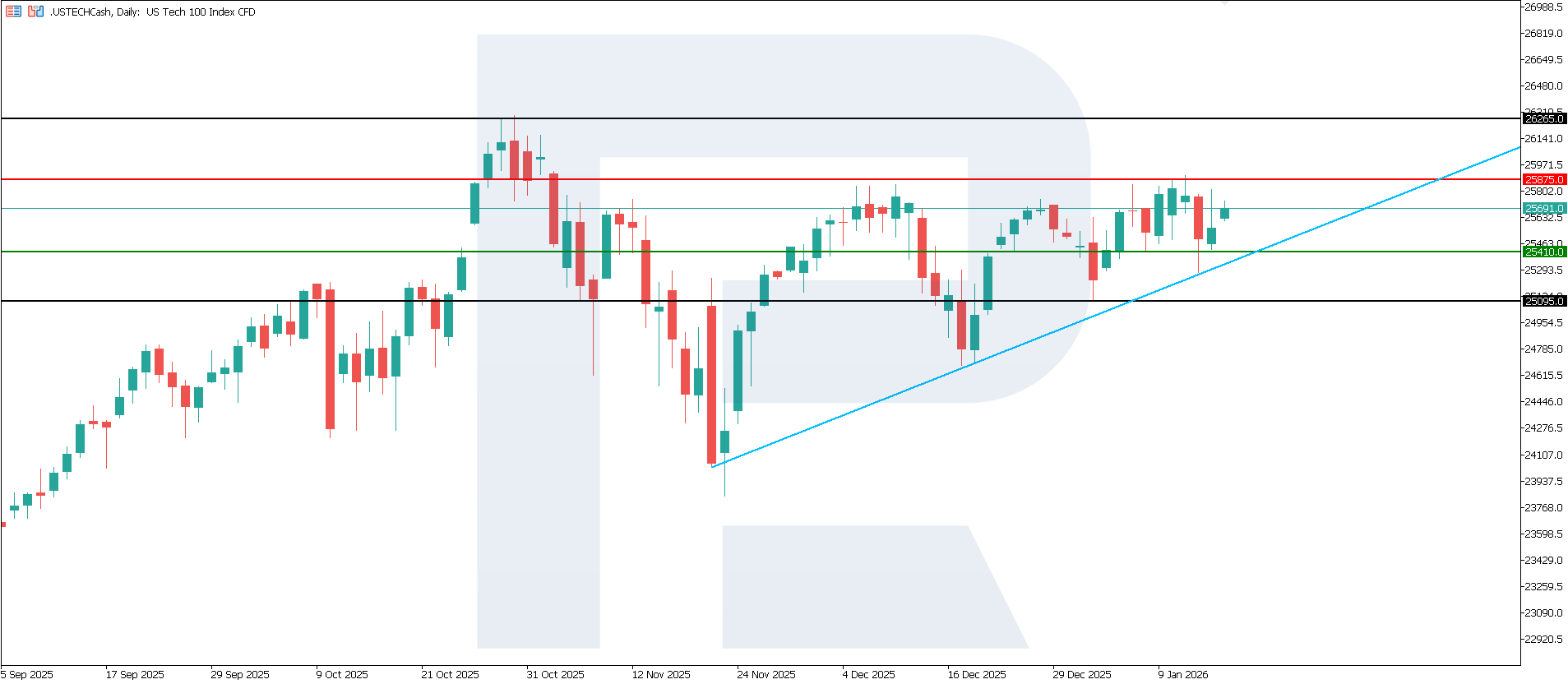 US Tech technical analysis for 16 January 2026The US Tech index entered an uptrend. The nearest resistance level has formed at 25,875.0, while the support level has shifted to 25,410.0. Prices are moving higher towards resistance, with a high probability of a breakout. The upside target could be at 26,265.0.