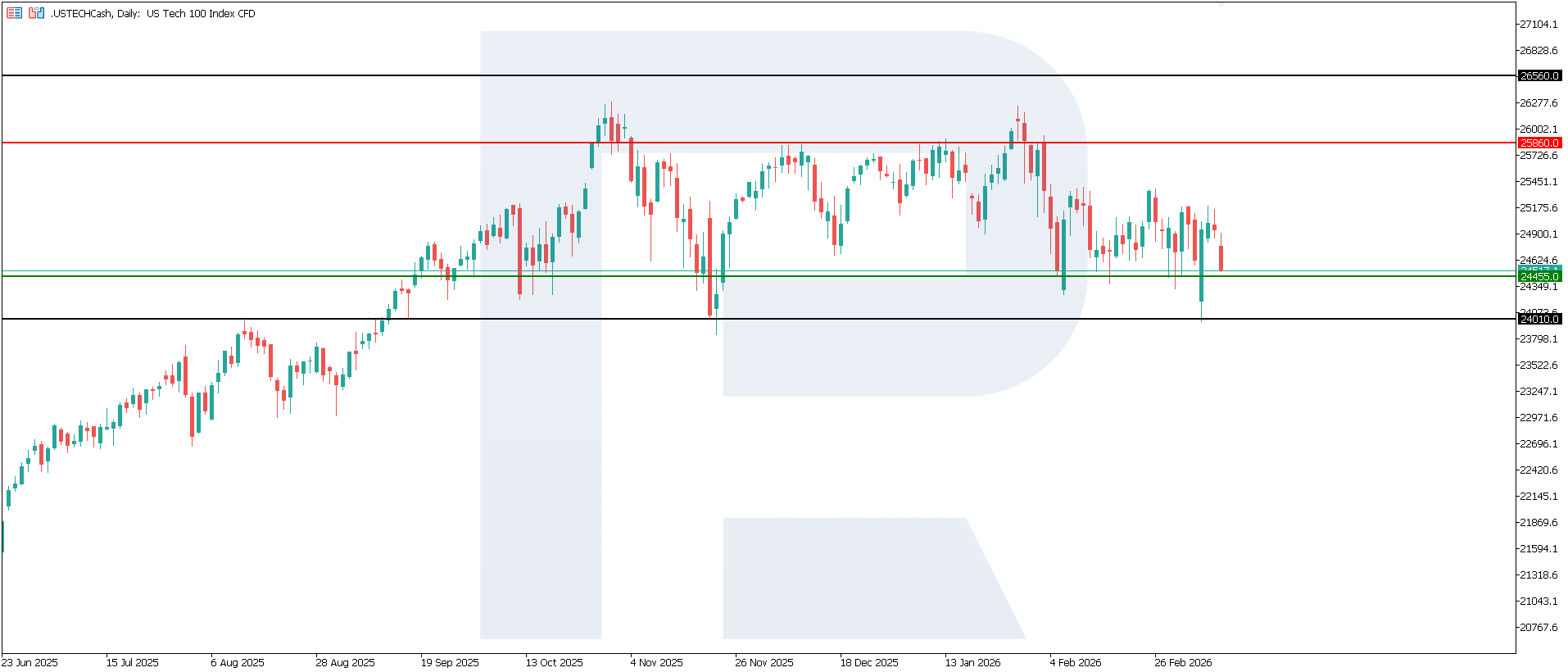 US Tech technical analysis for 13 March 2026The US Tech index is showing a downward bias. The nearest resistance level is located around 25,860.0, while the main support lies near 24,455.0. At the moment, prices are moving within a sideways range and testing the support level. If pressure persists, the next downside target could be 24,010.0.