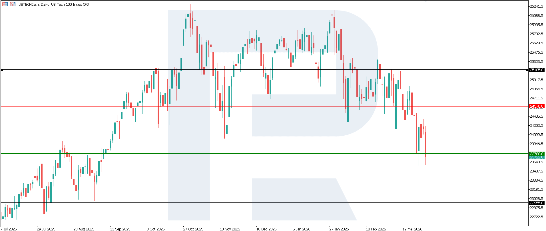US Tech technical analysis for 27 March 2026The US Tech index is showing downward momentum. The nearest resistance level is located around 24,570.0, while the main support level lies at 23,780.0. Prices are currently consolidating below support. If pressure persists, the next downside target could be the 22,955.0 area.