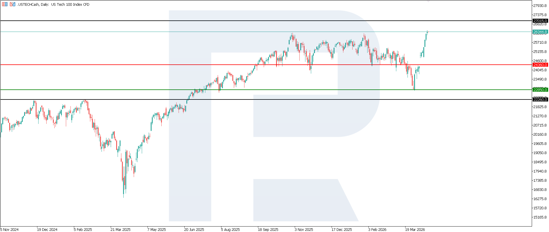 Overall, this news is rather moderately positive for the US Tech index, but does not guarantee strong growth. It confirms that the US economy remains resilient, reducing risks to corporate earnings and supporting the stock market overall. However, excessive labour market resilience could dampen expectations for near-term rate cuts, limiting upside potential for highly valued technology stocks. The next upside target could be 27,015.0.