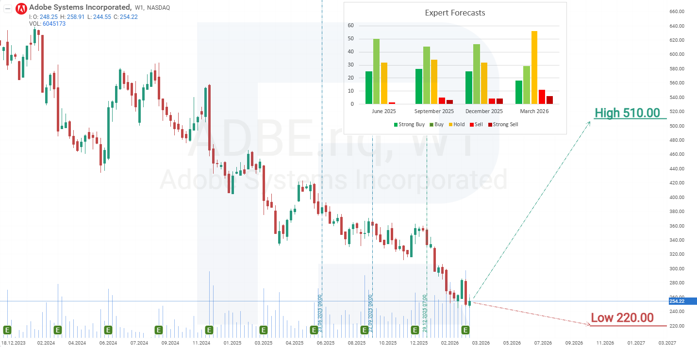 This article reviews Adobe Inc., outlining its revenue structure, summarising quarterly performance, and presenting expectations for the 2026 financial year. It also includes a technical analysis of ADBE shares, which forms the basis for the Adobe stock forecast for the 2026 calendar year.