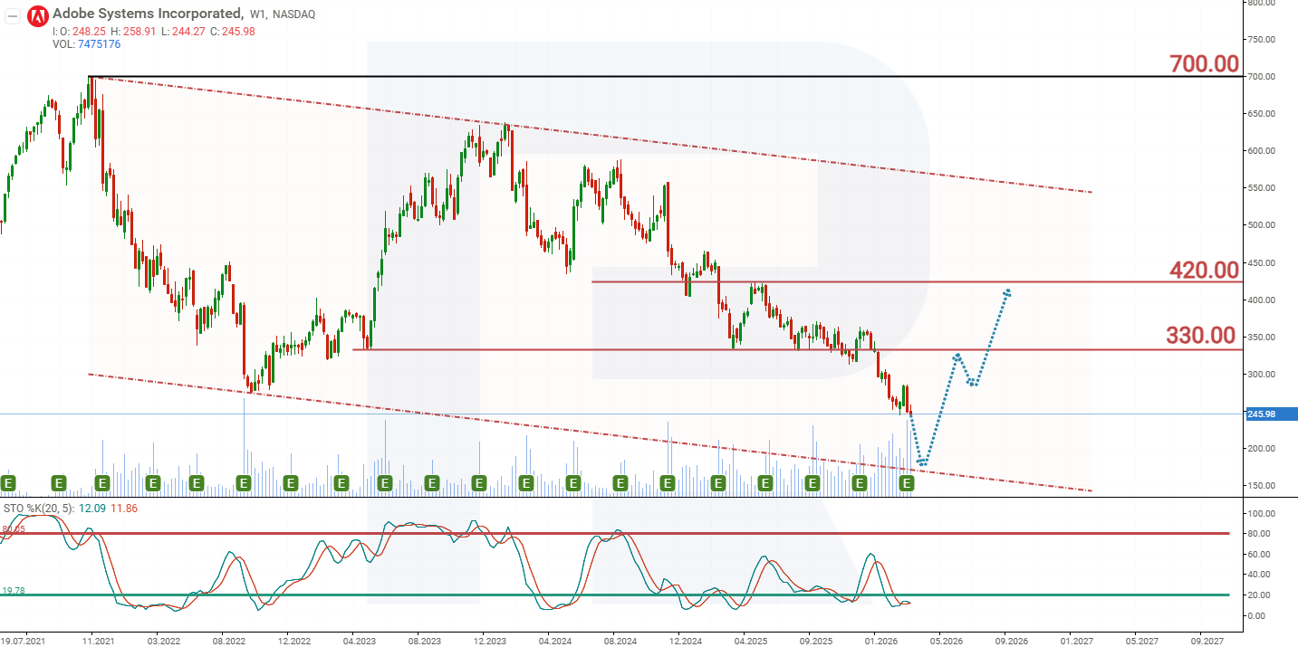 On the weekly timeframe, Adobe shares continue to trade within a descending channel. Despite a strong Q1 2026 report and a moderate valuation, investors remain concerned that developments in AI could erode Adobe’s market share, potentially weighing on future revenue and profits.