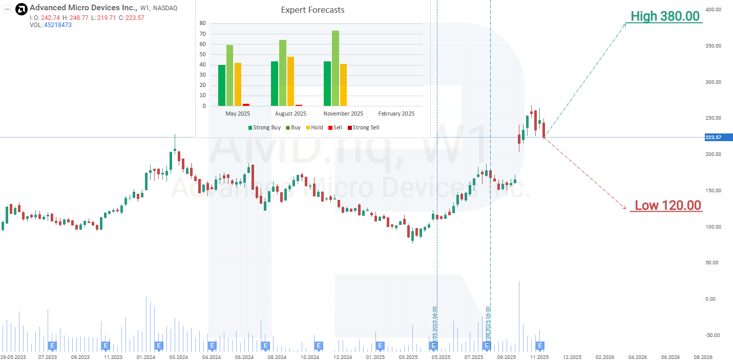 On the weekly chart, Advanced Micro Devices shares traded within an upward channel until October 2025. On 6 October 2025, a major agreement between AMD and OpenAI for the supply of AI chips, as well as an option granted to OpenAI to acquire up to 10% of the company’s shares, triggered a sharp rally in AMD’s stock, resulting in a breakout above the upper boundary of the ascending channel. Based on the current AMD stock performance, the potential scenarios for 2025 are as follows: