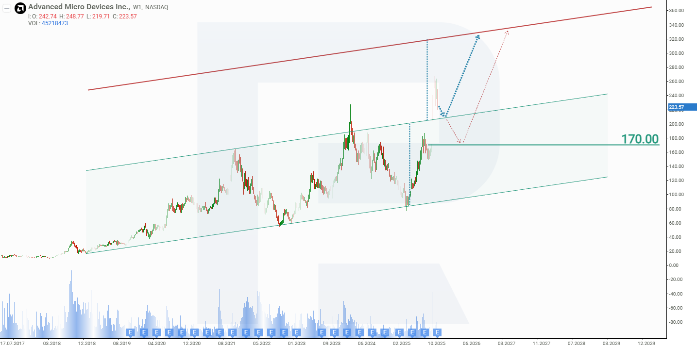 The base-case forecast for Advanced Micro Devices shares anticipates a test of the upper boundary of the breached channel at around 210 USD, which now serves as support, followed by a rebound and a potential rise in the share price to the height of the channel, up to 320 USD.