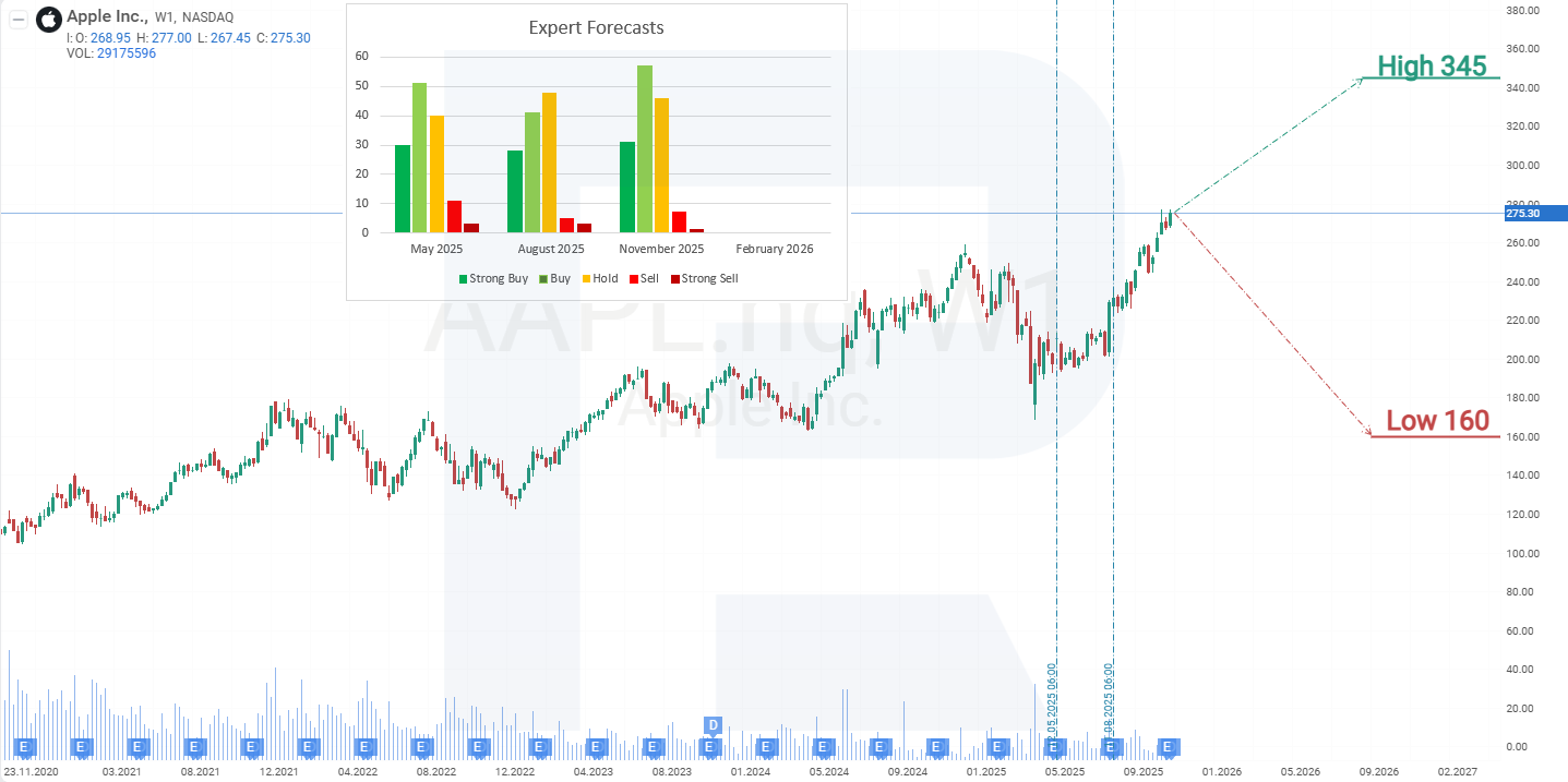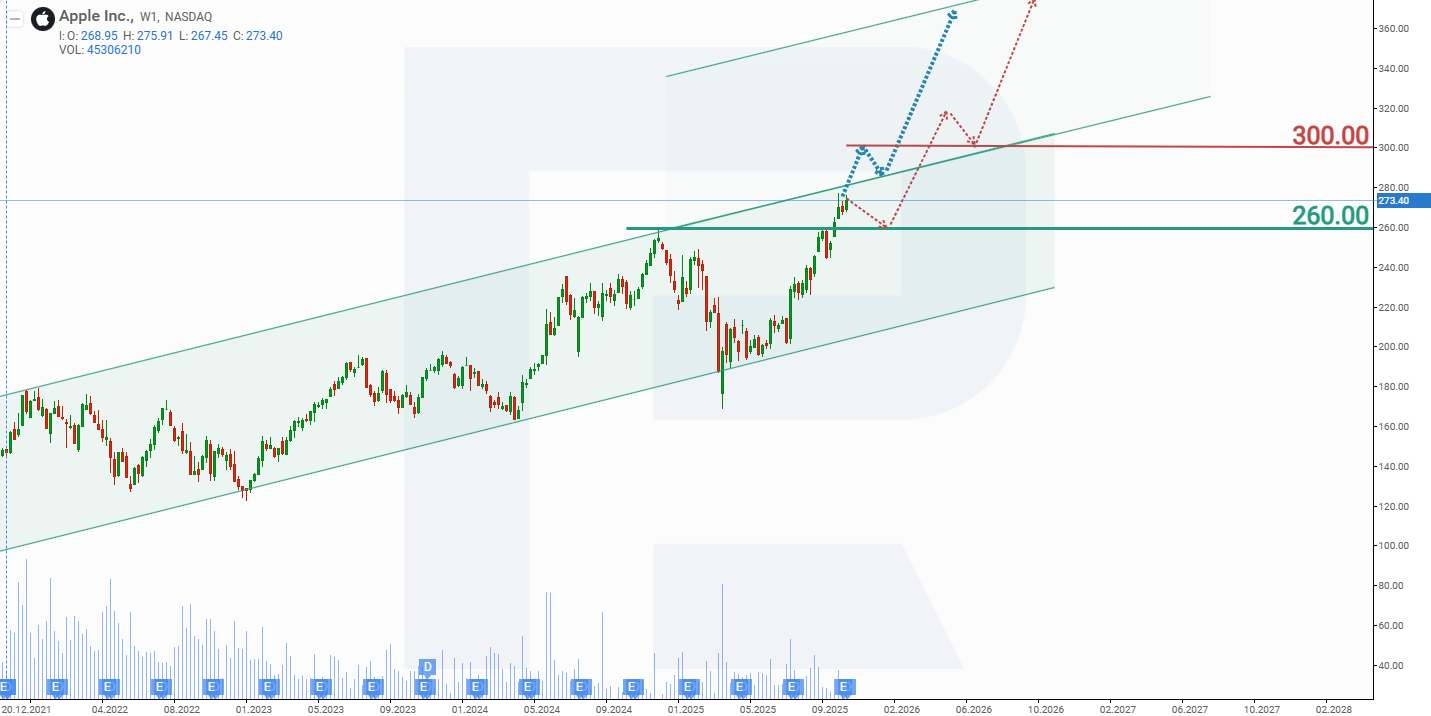 On the weekly timeframe, Apple shares are trading within an upward channel and have reached its upper boundary, which acts as resistance. Tim Cook’s visit to the White House in August 2025 had a positive impact on both AAPL’s share price and the company’s financial performance. As a result, AAPL shares rose by around 35% between August and November, with no significant corrections. The record quarter, optimistic guidance for the next period, and the launch of new products ahead of the holiday season all create conditions for further upside in AAPL stock. Based on the current performance of Apple shares, the potential scenarios for AAPL price movement in 2025 are as follows: