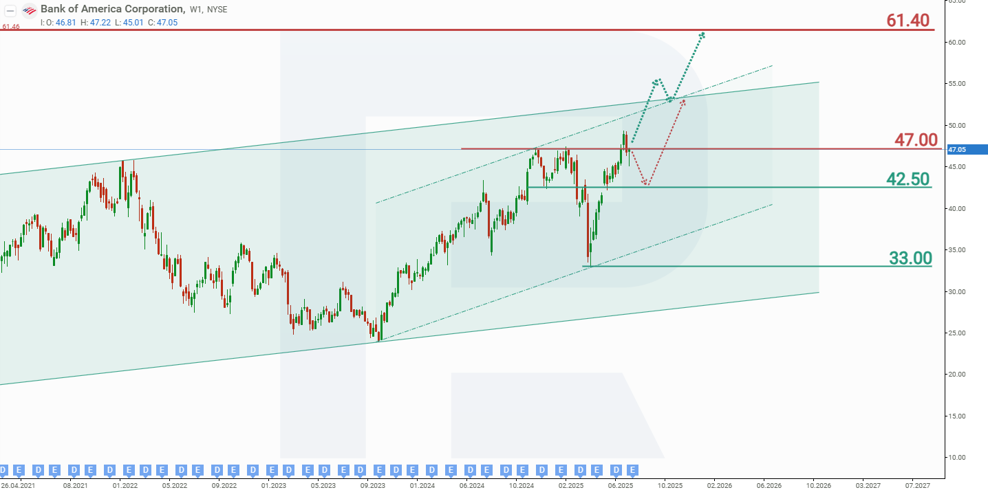 The alternative scenario for Bank of America Corporation stock assumes a breakout above the upper boundary of the channel. In this case, the share price could rise towards 66.00 USD.