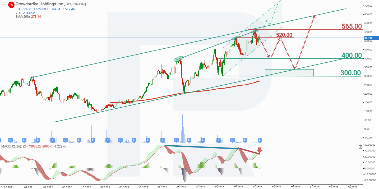 At the beginning of November, CRWD shares pulled back from the upper boundary of the channel and began to decline. Additional pressure on the stock has been reinforced by a divergence forming on the MACD indicator. Based on the current performance of CrowdStrike Holdings shares, the potential movement scenarios for 2026 are as follows.