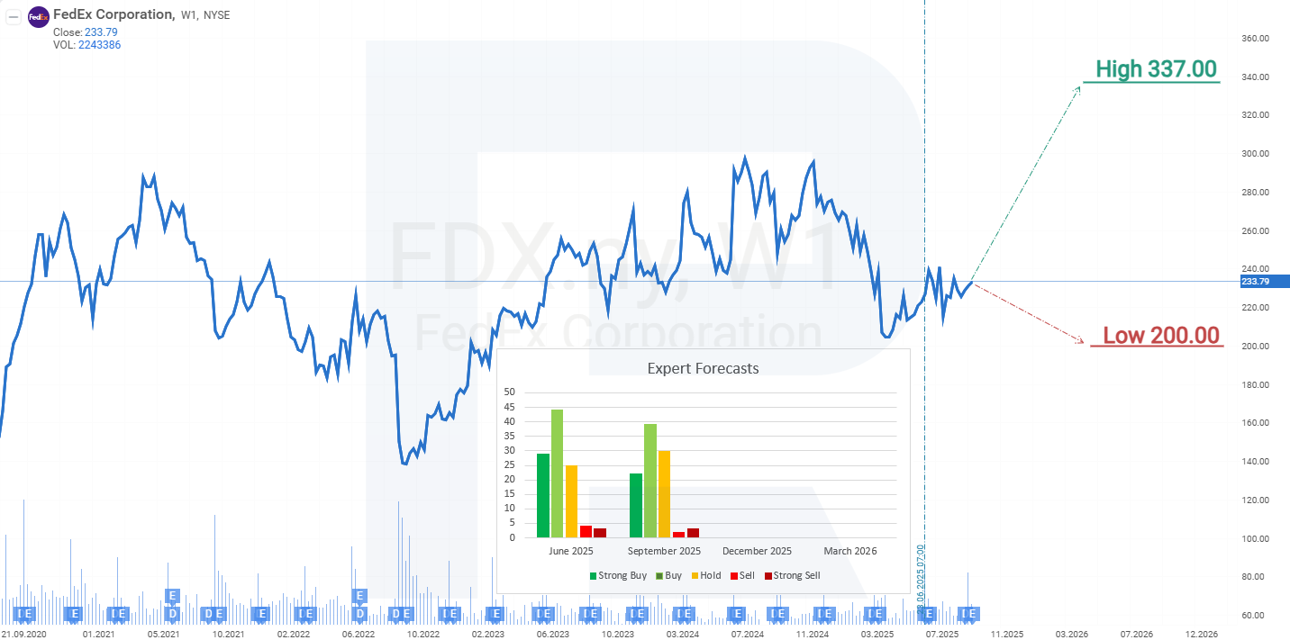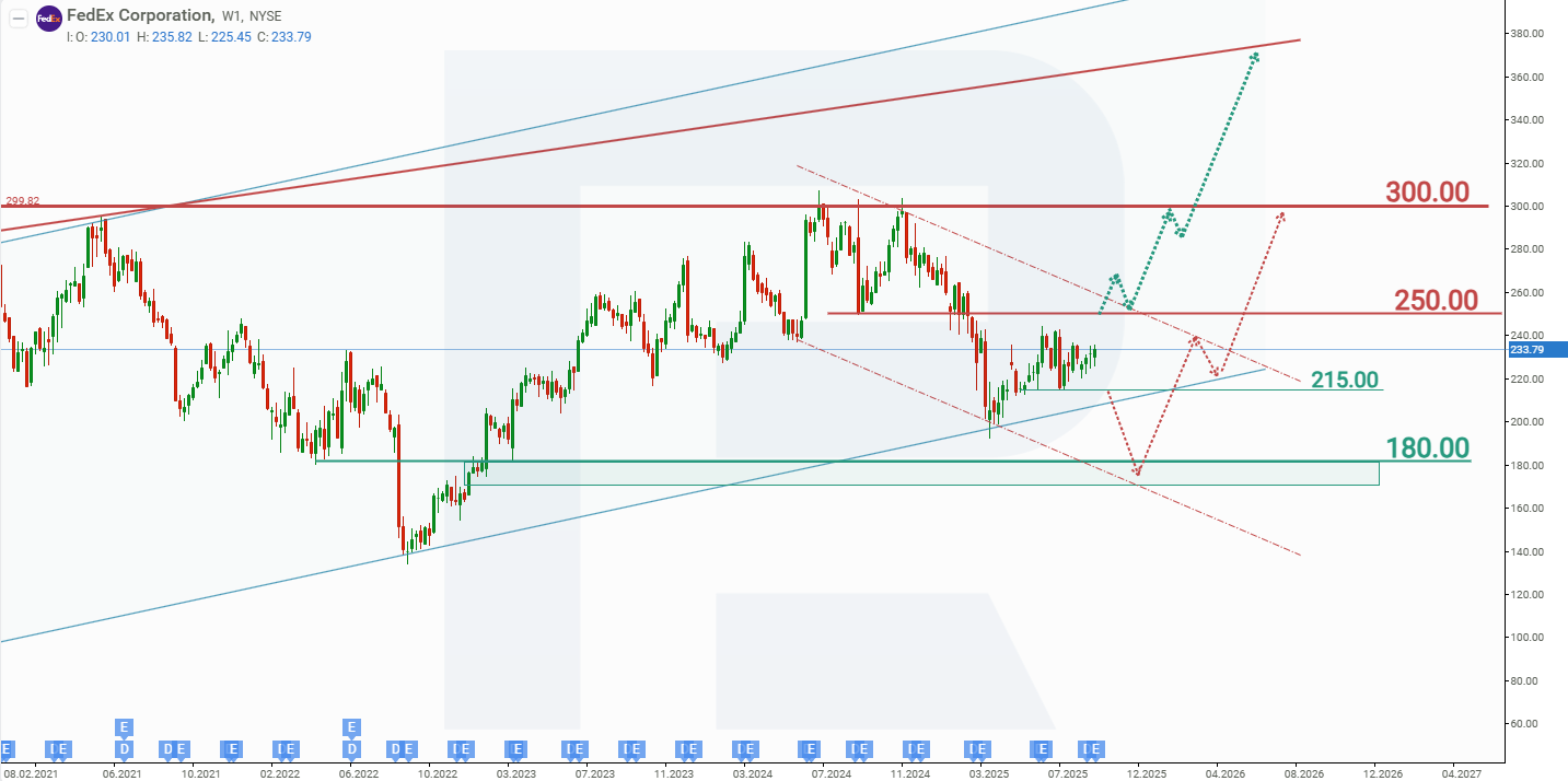 The Q4 FY2025 report did not trigger significant movements in FDX shares, which continued to trade in the 215–240 USD range. The Q1 FY2026 report likewise prompted little investor reaction, with the stock remaining within the same band. However, the latest results show that the company is successfully overcoming emerging challenges while maintaining strong financial resilience. Based on the current performance of FedEx shares, the two possible forecast scenarios for 2025 are as follows: